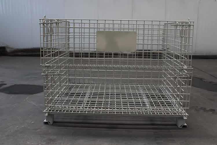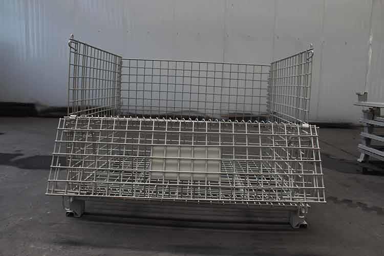 移动式美固笼外形轻巧,笼体除底框外都有铁丝碰焊成的网片组合而成;网片与网片、网片与底框靠小连接件连接,可活动。且前后面可打开,在堆垛后能取物,堆垛时承重在侧面的网片上。该移动式美固笼已完全具备可堆垛性、可折叠性及可搬运性,日益成为物流流通的一种重要物流容器。
